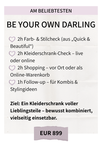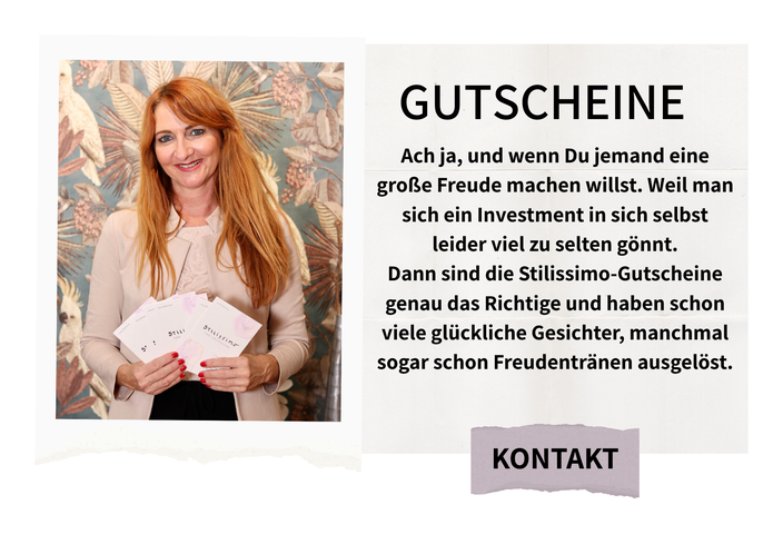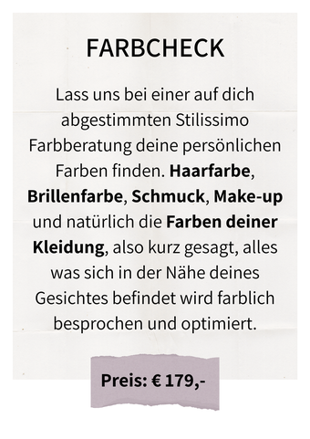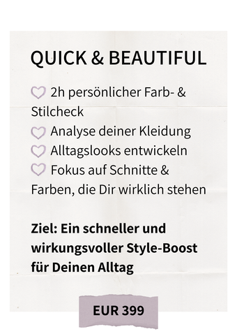Manchmal braucht es nur einen liebevollen Blick von außen, um sich selbst wieder mit neuen Augen zu sehen. Ich zeige Dir, wie Du mit den richtigen Farben strahlst, mit Deinem Stil in Einklang kommst und Deine Garderobe endlich nur noch aus kombinierbaren Lieblingsteilen besteht.