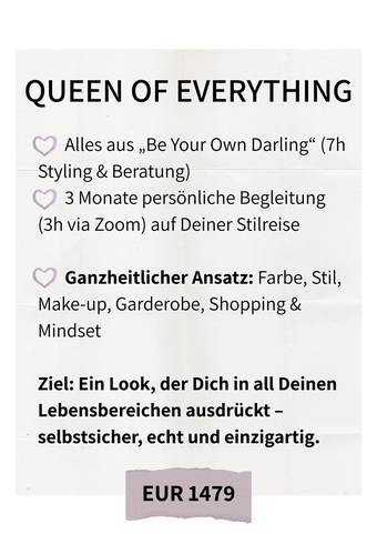 Weil Du alles bist und alles sein darfst. Queen of everything ist eine Hommage an jede Frau, die sich in ihrer ganzen Schönheit sichtbar machen will. Stark. Weiblich. Einzigartig. Voller Leben. Dieses exklusive Stilissimo Rundum-Package verbindet alles was Dich als Frau zum Strahlen bringt. Farbe. Stil. Make-up. Kleiderschrank. Personal Shopping. Authentizität. Persönlichkeit. Zeit für Dich und Deine Bedürfnisse - achtsam, liebevoll und auf Dich abgestimmt.